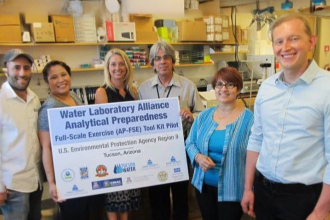 Tucson Water, in coordination with the U.S. Environmental Protection Agency (USEPA), conducted the Water Laboratory Alliance Analytical Preparedness Full-Scale Exercise that spanned multiple locations and time zones. In addition to ESRAC, four other laboratories were involved in the exercise, each responding to a unique set of testing and protocol challenges or injects. More than 25 representatives from Tucson Water, USEPA, Pima County Office of Emergency Management, Pima County Health Department, Pima County Wastewater Reclamation Department, the Tucson Office of Emergency Management and Homeland Security, and the University of Arizona participated as players, observers, evaluators and responders in the exercise.